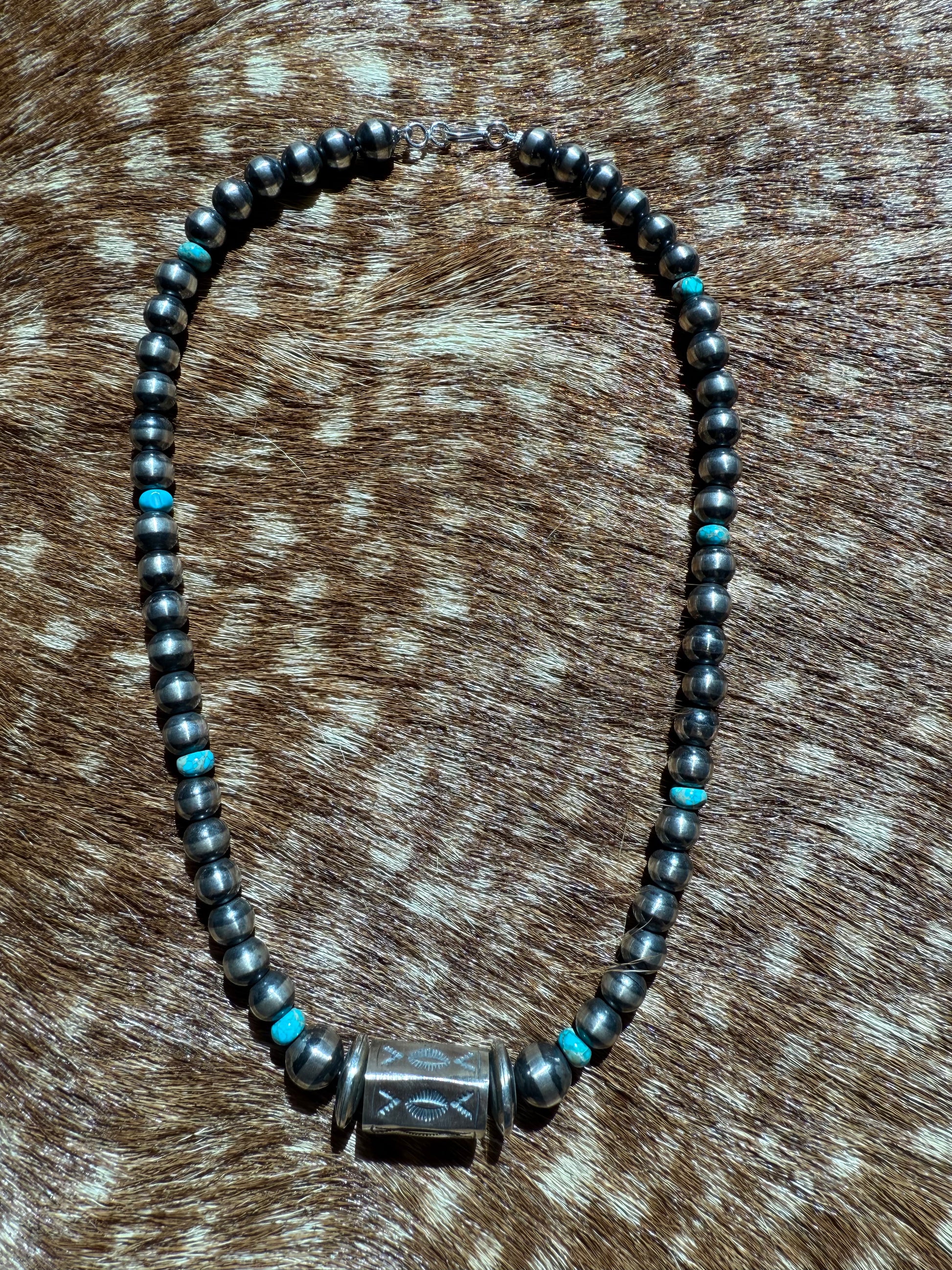Single stamped barrel bead with saucer pearls and natural Kingman stones throughout.